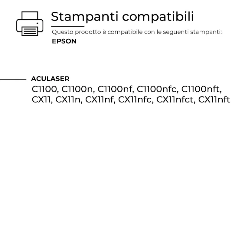 Questo Toner per Epson è pienamente compatibile con molteplici modelli di stampanti EPSON e assicura una resa di stampa elevata e costante, paragonabile a quella dei prodotti originali. Progettato per offrire affidabilità e precisione.