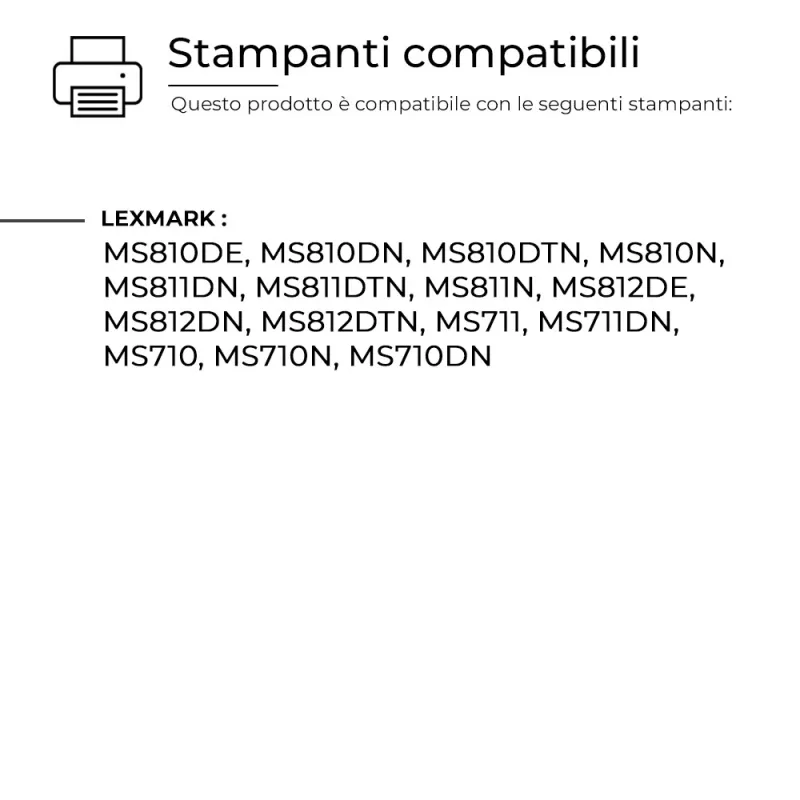Questo Toner per Lexmark è pienamente compatibile con molteplici modelli di stampanti LEXMARK e assicura una resa di stampa elevata e costante, paragonabile a quella dei prodotti originali. Progettato per offrire affidabilità e precisione.