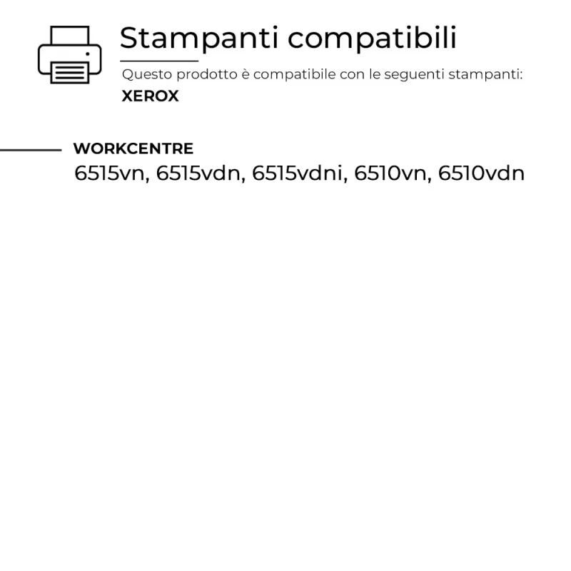 Questo Toner per Xerox è pienamente compatibile con molteplici modelli di stampanti XEROX e assicura una resa di stampa elevata e costante, paragonabile a quella dei prodotti originali. Progettato per offrire affidabilità e precisione.