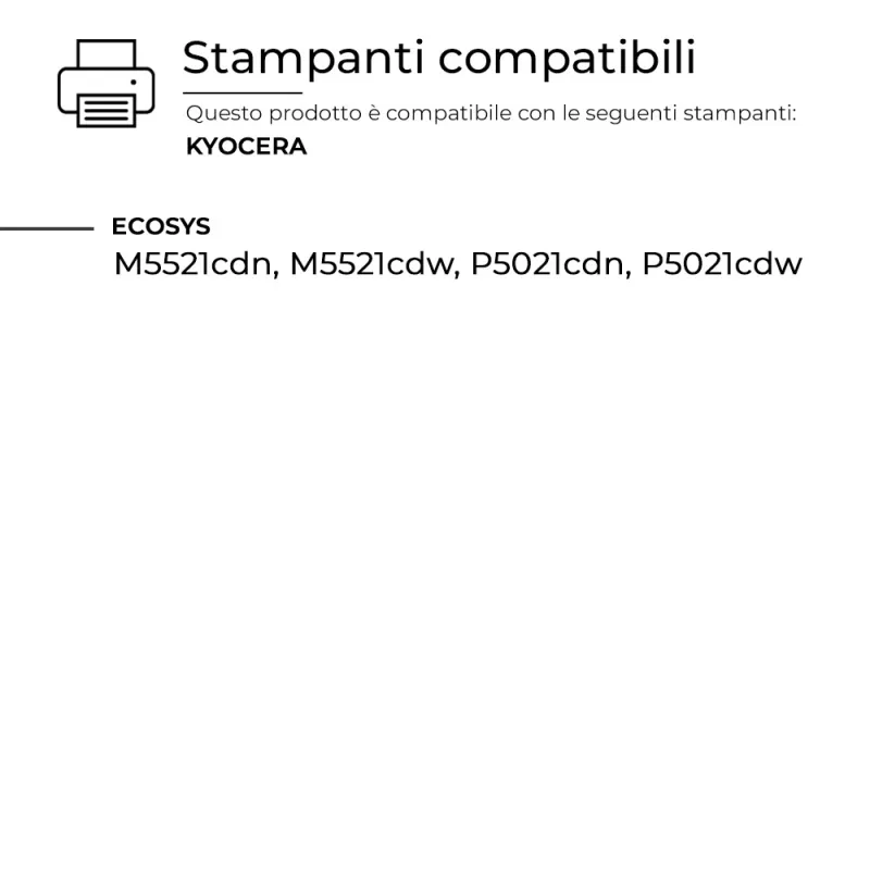 Questo Toner per Kyocera è pienamente compatibile con molteplici modelli di stampanti KYOCERA e assicura una resa di stampa elevata e costante, paragonabile a quella dei prodotti originali. Progettato per offrire affidabilità e precisione.