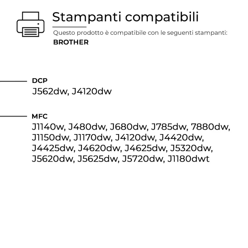 Queste Cartucce per Brother sono pienamente compatibili con molteplici modelli di stampante BROTHER e assicurano una resa di stampa elevata e costante, paragonabile a quella dei prodotti originali. Progettate per offrire affidabilità e precisione.