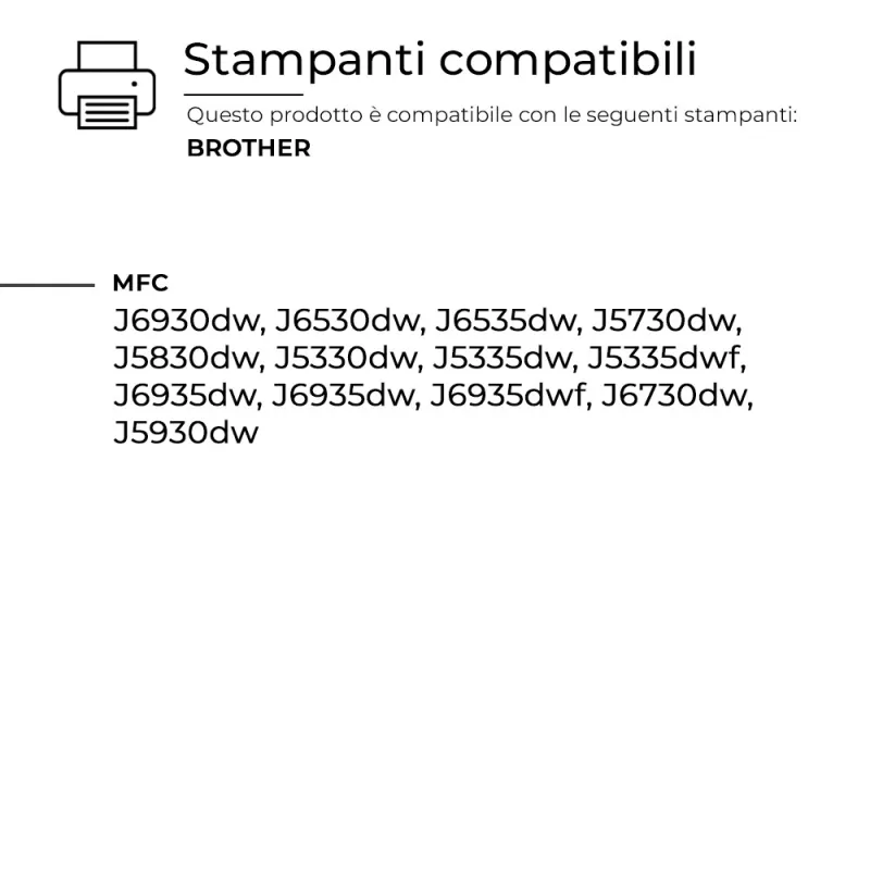 Queste Cartucce per Brother sono pienamente compatibili con molteplici modelli di stampante BROTHER e assicurano una resa di stampa elevata e costante, paragonabile a quella dei prodotti originali. Progettate per offrire affidabilità e precisione.