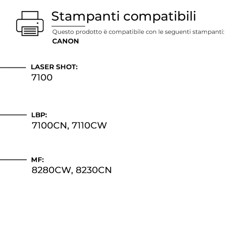Questo Toner per Canon è pienamente compatibile con molteplici modelli di stampanti CANON e assicura una resa di stampa elevata e costante, paragonabile a quella dei prodotti originali. Progettato per offrire affidabilità e precisione.