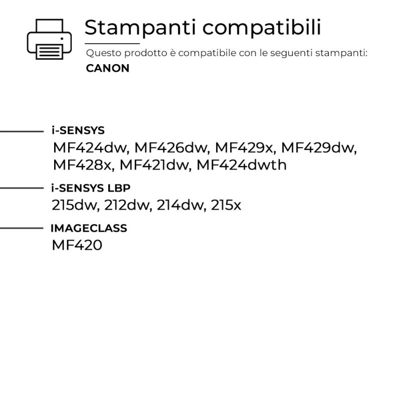 Questo Toner per Canon è pienamente compatibile con molteplici modelli di stampanti CANON e assicura una resa di stampa elevata e costante, paragonabile a quella dei prodotti originali. Progettato per offrire affidabilità e precisione.