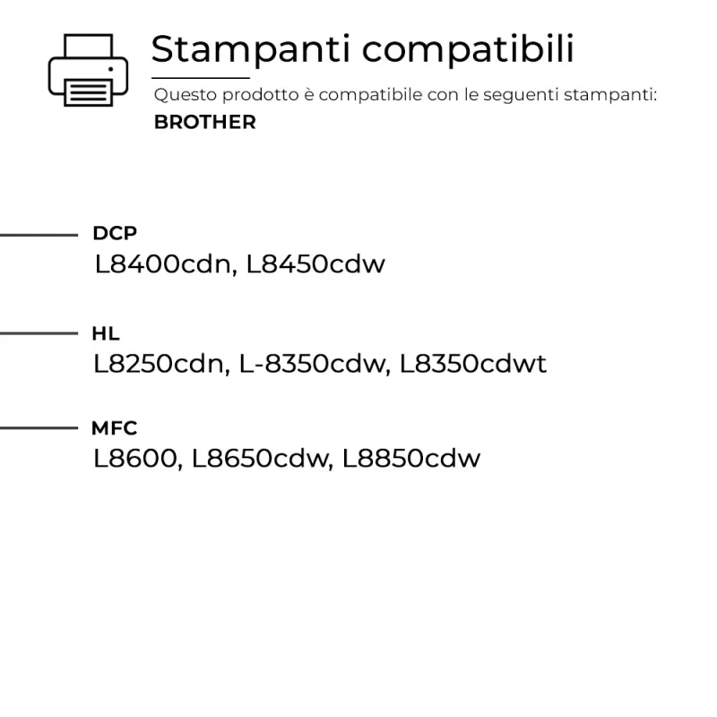 Questo Toner per Brother è pienamente compatibile con molteplici modelli di stampanti BROTHER e assicura una resa di stampa elevata e costante, paragonabile a quella dei prodotti originali. Progettato per offrire affidabilità e precisione.