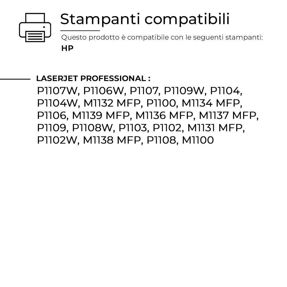 Questo Toner per HP è pienamente compatibile con molteplici modelli di stampanti HP e assicura una resa di stampa elevata e costante, paragonabile a quella dei prodotti originali. Progettato per offrire affidabilità e precisione.