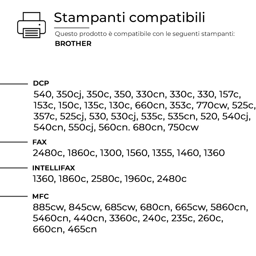 Queste Cartucce per Brother sono pienamente compatibili con molteplici modelli di stampante BROTHER e assicurano una resa di stampa elevata e costante, paragonabile a quella dei prodotti originali. Progettate per offrire affidabilità e precisione.