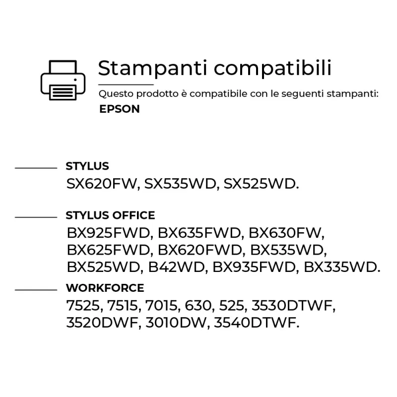 Queste Cartucce per Epson sono pienamente compatibili con molteplici modelli di stampante EPSON e assicurano una resa di stampa elevata e costante, paragonabile a quella dei prodotti originali. Progettate per offrire affidabilità e precisione.