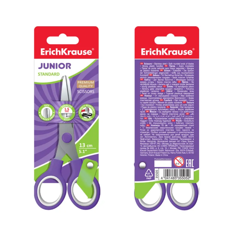 Forbici Erichkrause robuste e precise, progettate per garantire tagli netti e sicuri su carta e altri materiali leggeri. Strumento affidabile e pratico per utilizzo quotidiano in ufficio, a scuola o a casa.