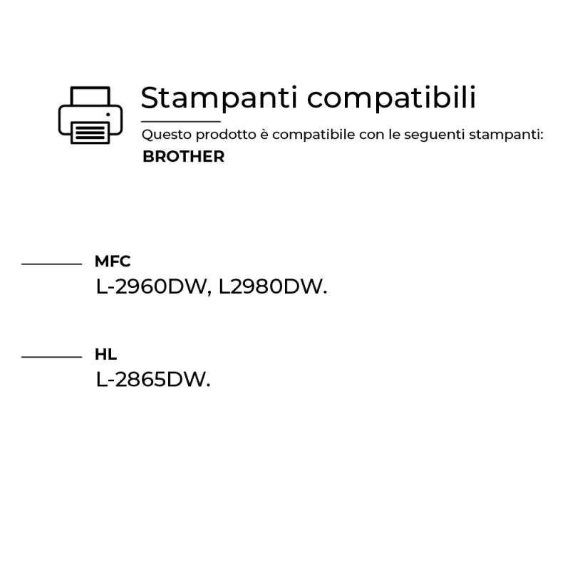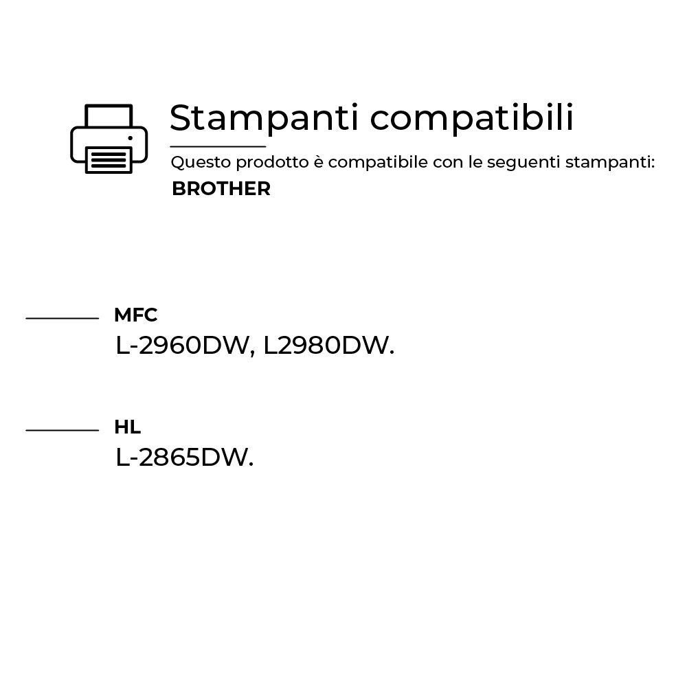 Questo Toner per Brother è pienamente compatibile con molteplici modelli di stampanti BROTHER e assicura una resa di stampa elevata e costante, paragonabile a quella dei prodotti originali. Progettato per offrire affidabilità e precisione.