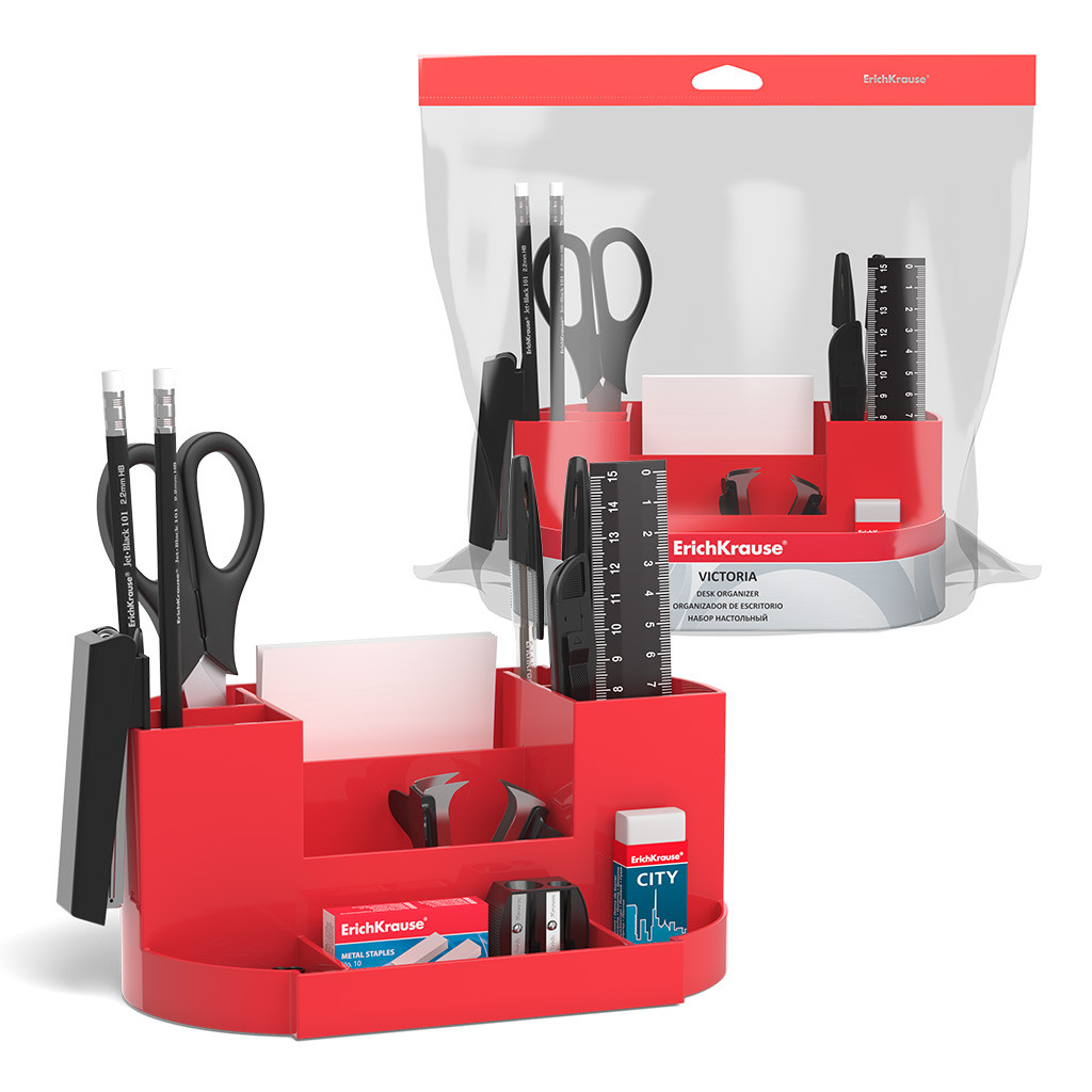 Il set comprende 14 articoli: 2 penne, 2 matite, righello, temperino, gomma, graffette, pinzatrice №10, punti metallici, forbici, coltello da cancelleria, blocco di carta per appunti. I componenti del set possono differire dall'immagine.