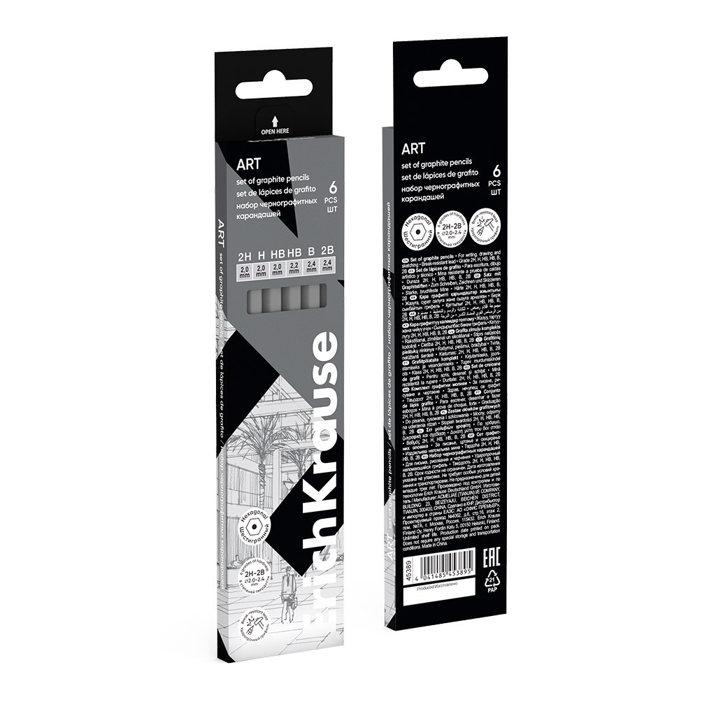 Matite classiche esagonali a mina nera in legno selezionato. Grado di durezza: HB. Una speciale impregnazione del legno e un solido incollaggio della mina garantiscono un'elevata resistenza alla rottura. Il legno morbido e il perfetto allineamento della mina consentono una facile affilatura e un uso economico della matita. La mina di 2,2 mm di diametro non graffia la carta e non si sbriciola. La gomma di media durezza è prodotta con una moderna gomma termoplastica (TPR) ecologica e ipoallergenica, non contenente PVC. Lunghezza della matita: 188 mm.