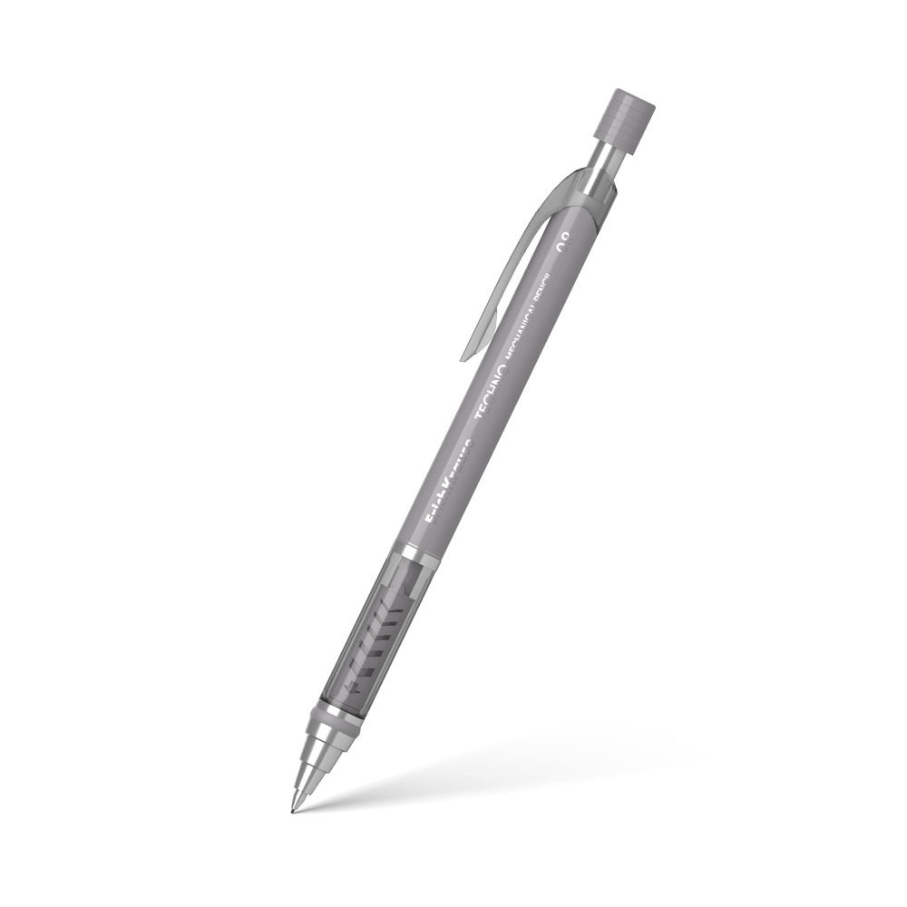 Matita meccanica con fusto rotondo e impugnatura profilata, pinza metallica e caricamento automatico della mina.