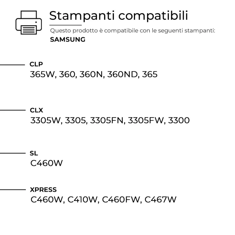 Questo Toner per Samsung è pienamente compatibile con molteplici modelli di stampanti SAMSUNG e assicura una resa di stampa elevata e costante, paragonabile a quella dei prodotti originali. Progettato per offrire affidabilità e precisione.