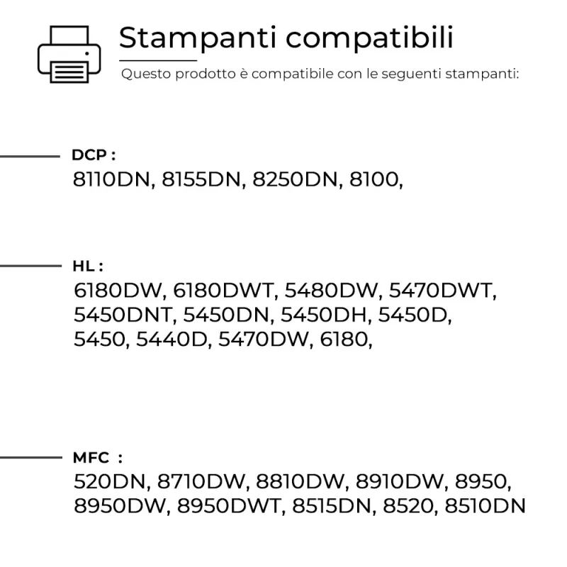 - Compatibilità totale con le stampanti Brother che utilizzano il tamburo