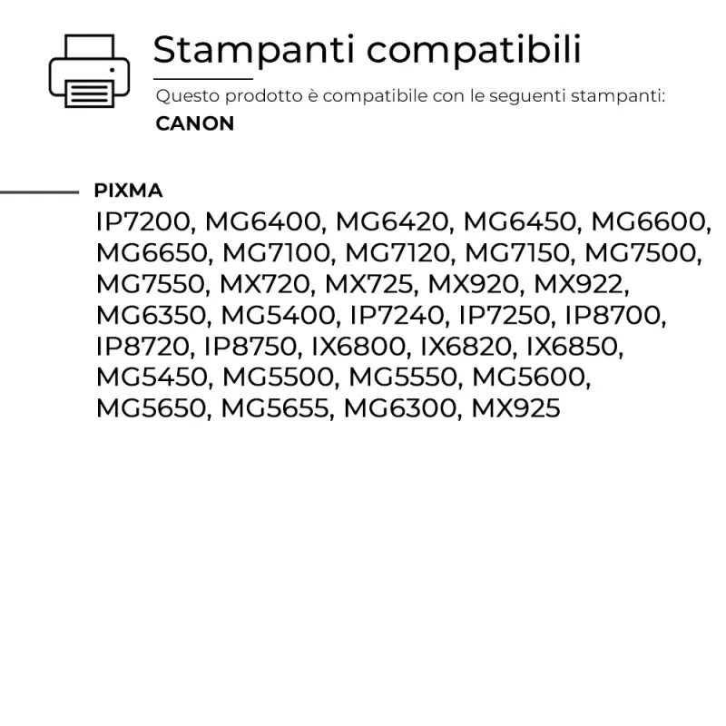 Queste Cartucce per Canon sono pienamente compatibili con molteplici modelli di stampante CANON e assicurano una resa di stampa elevata e costante, paragonabile a quella dei prodotti originali. Progettate per offrire affidabilità e precisione.