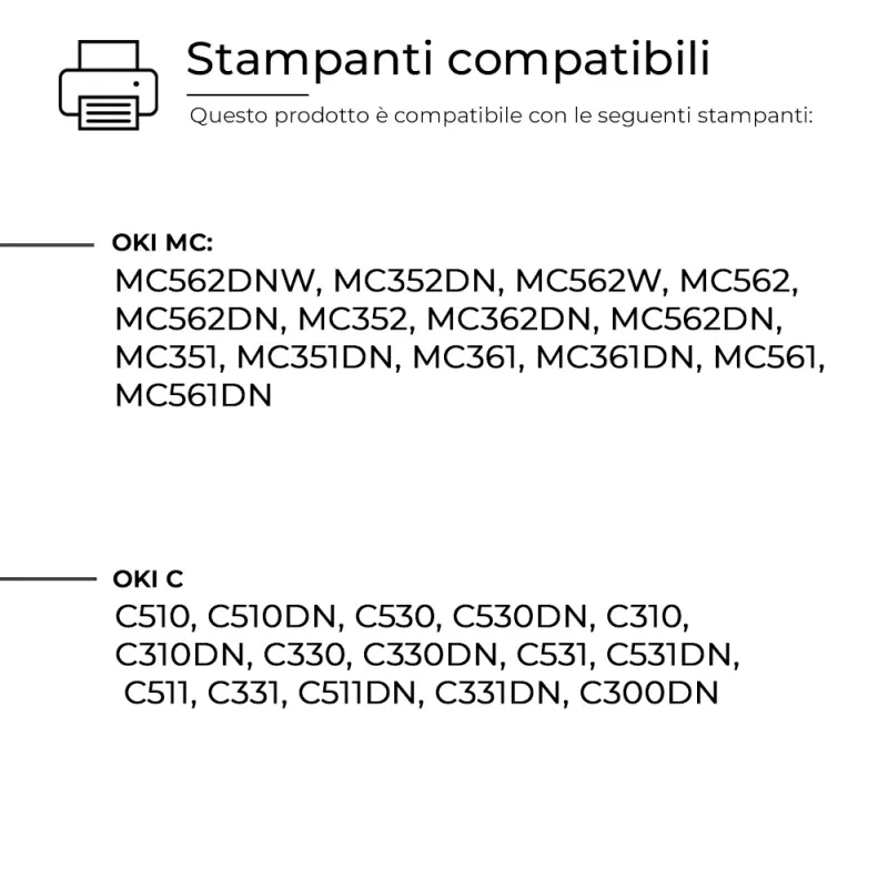 Questo Toner per Oki è pienamente compatibile con molteplici modelli di stampanti OKI SYSTEM e assicura una resa di stampa elevata e costante, paragonabile a quella dei prodotti originali. Progettato per offrire affidabilità e precisione.