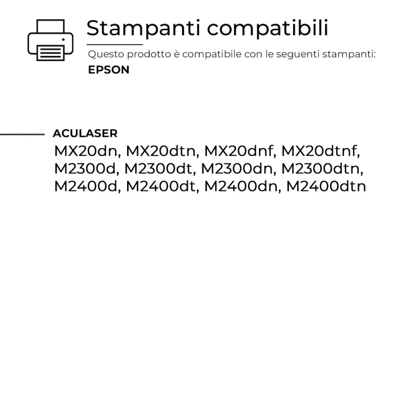 Questo Toner per Epson è pienamente compatibile con molteplici modelli di stampanti EPSON e assicura una resa di stampa elevata e costante, paragonabile a quella dei prodotti originali. Progettato per offrire affidabilità e precisione.