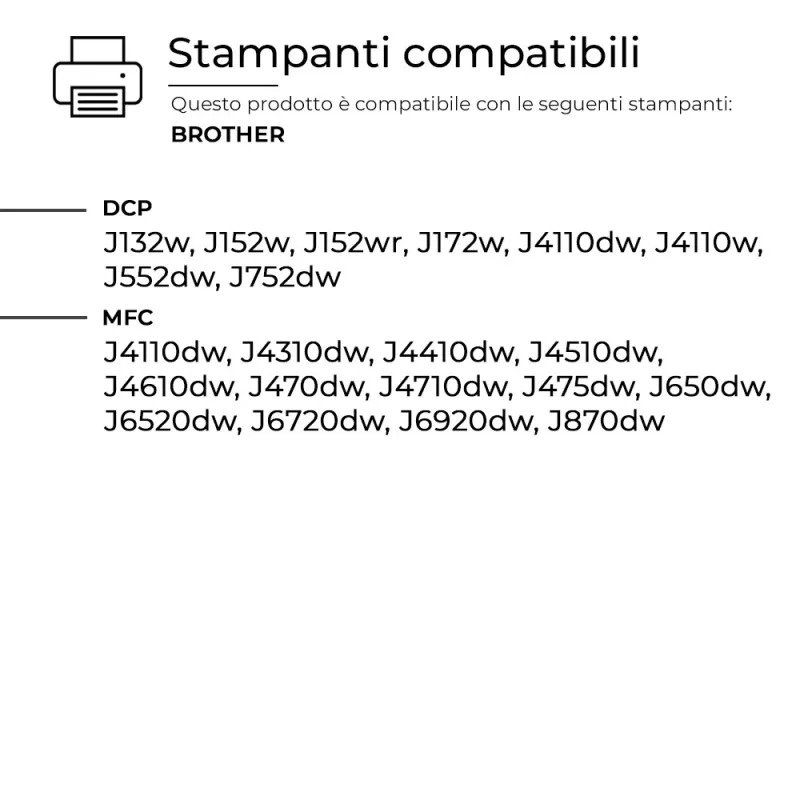 Queste Cartucce per Brother sono pienamente compatibili con molteplici modelli di stampante BROTHER e assicurano una resa di stampa elevata e costante, paragonabile a quella dei prodotti originali. Progettate per offrire affidabilità e precisione.