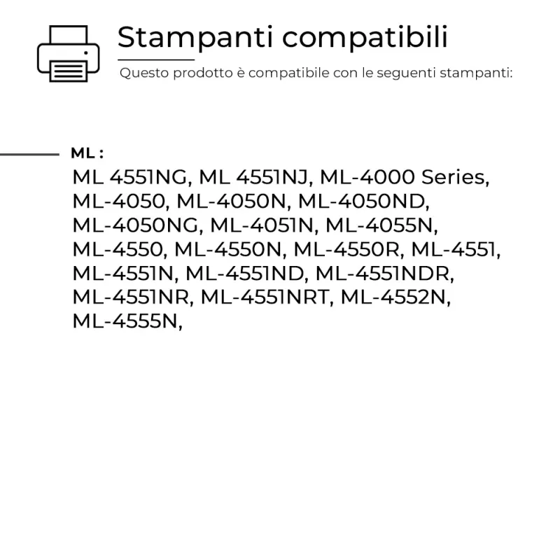 Questo Toner per Samsung è pienamente compatibile con molteplici modelli di stampanti SAMSUNG e assicura una resa di stampa elevata e costante, paragonabile a quella dei prodotti originali. Progettato per offrire affidabilità e precisione.