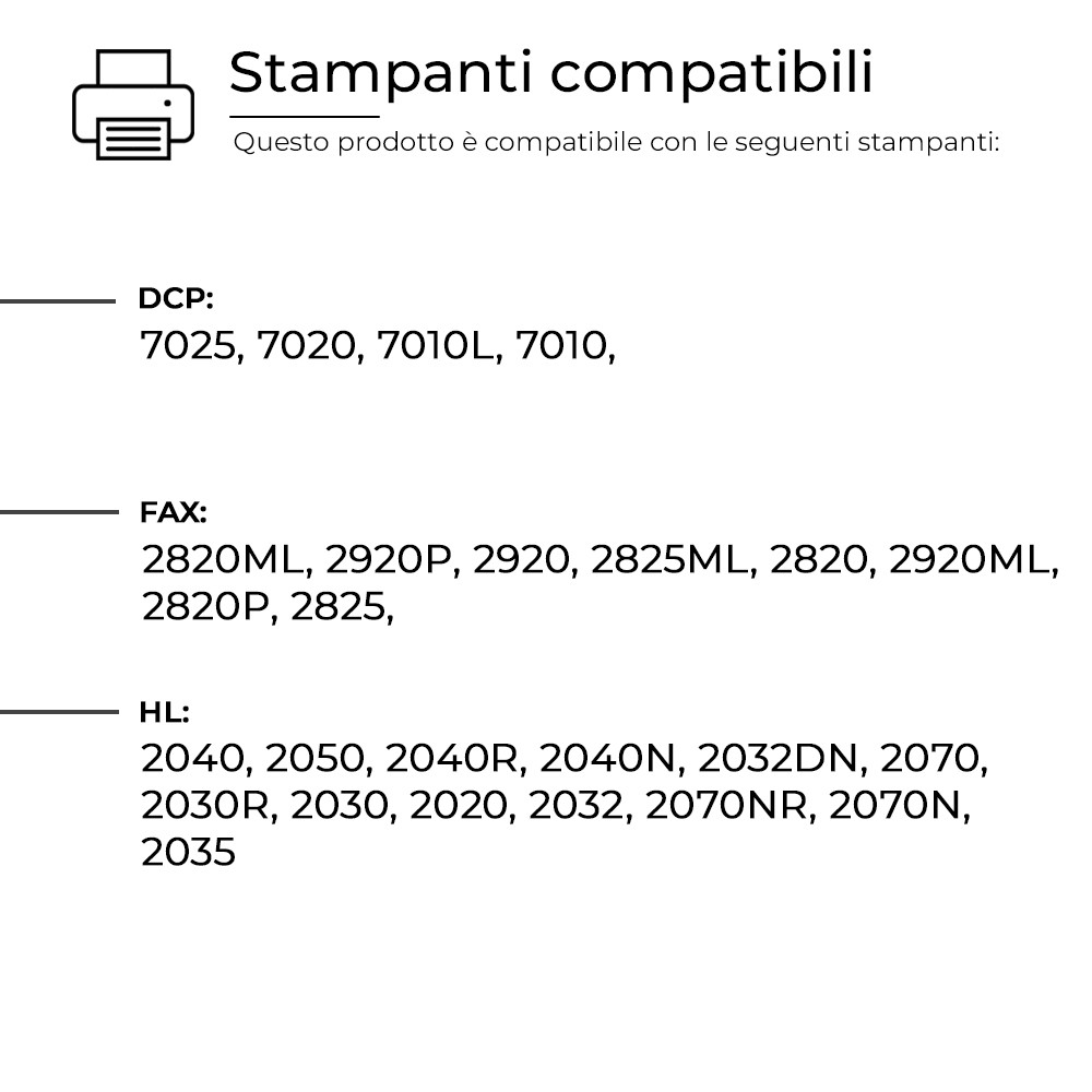 Questo Toner per Brother è pienamente compatibile con molteplici modelli di stampanti BROTHER e assicura una resa di stampa elevata e costante, paragonabile a quella dei prodotti originali. Progettato per offrire affidabilità e precisione.
