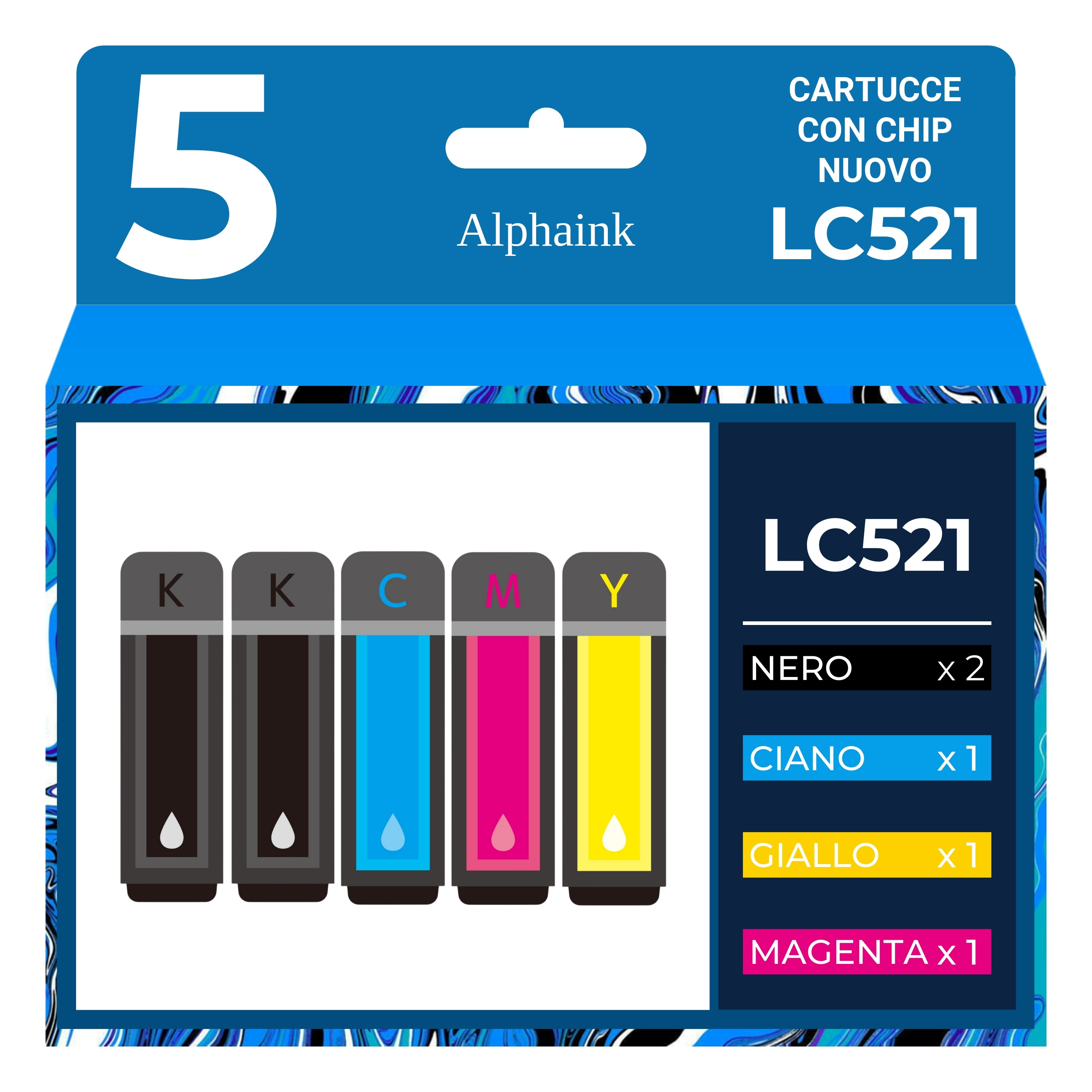 Scegli Alphaink, azienda leader nella vendita online di cartucce compatibili, e porta la qualità professionale nel tuo ufficio con il kit da 5 cartucce colorate compatibili per Brother LC-521.