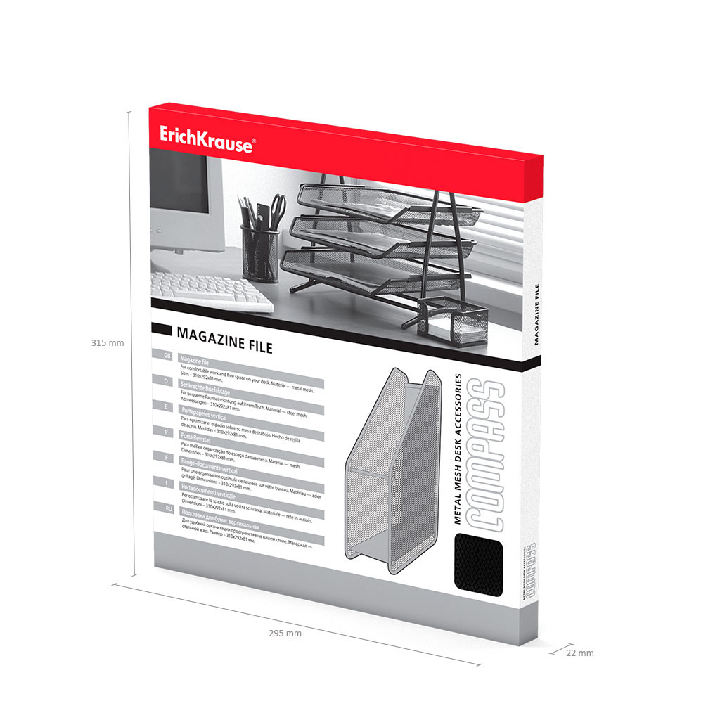 Stand verticale per scrivanie ideale per reggere e archiviare documenti, riviste e cataloghi. Realizzato in rete metallica mesh di colore nero. Ogni stand è inscatolato e venduto singolarmente, all'interno di una scatola protettiva. Il metallo resistente agli urti con cui viene fabbricato ne assicura la lunga durata e, contemporaneamente, leggerezza e comodità di utilizzo. Poco ingombro e tanto risparmio di spazio sulla scrivania per archiviare tutti i tuoi documenti, rivisti e cataloghi.